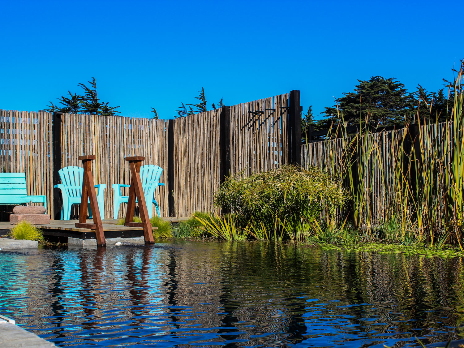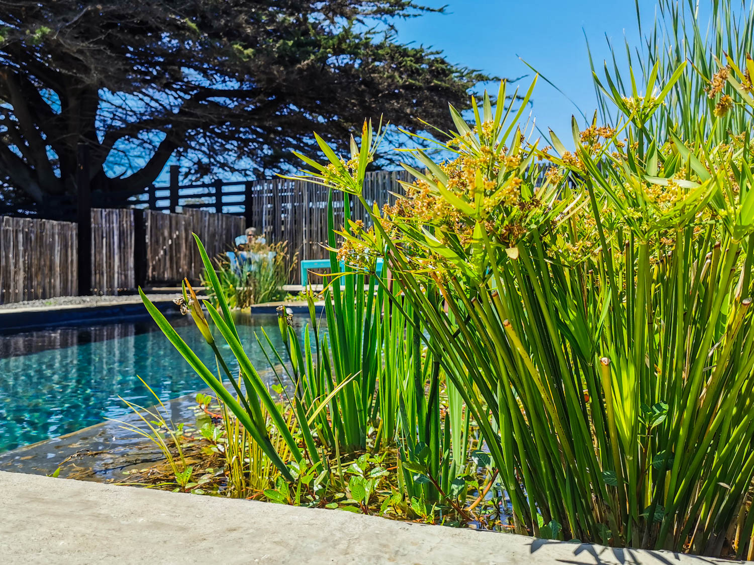 En este proyecto se aprovechó un sector del jardín que no tenía uso definido, transformándolo en una piscina natural de 30 m² integrada a la pendiente del terreno mediante un sistema de rebalse tipo “sin fin”, que resalta la topografía y genera una sensación de continuidad con el paisaje.