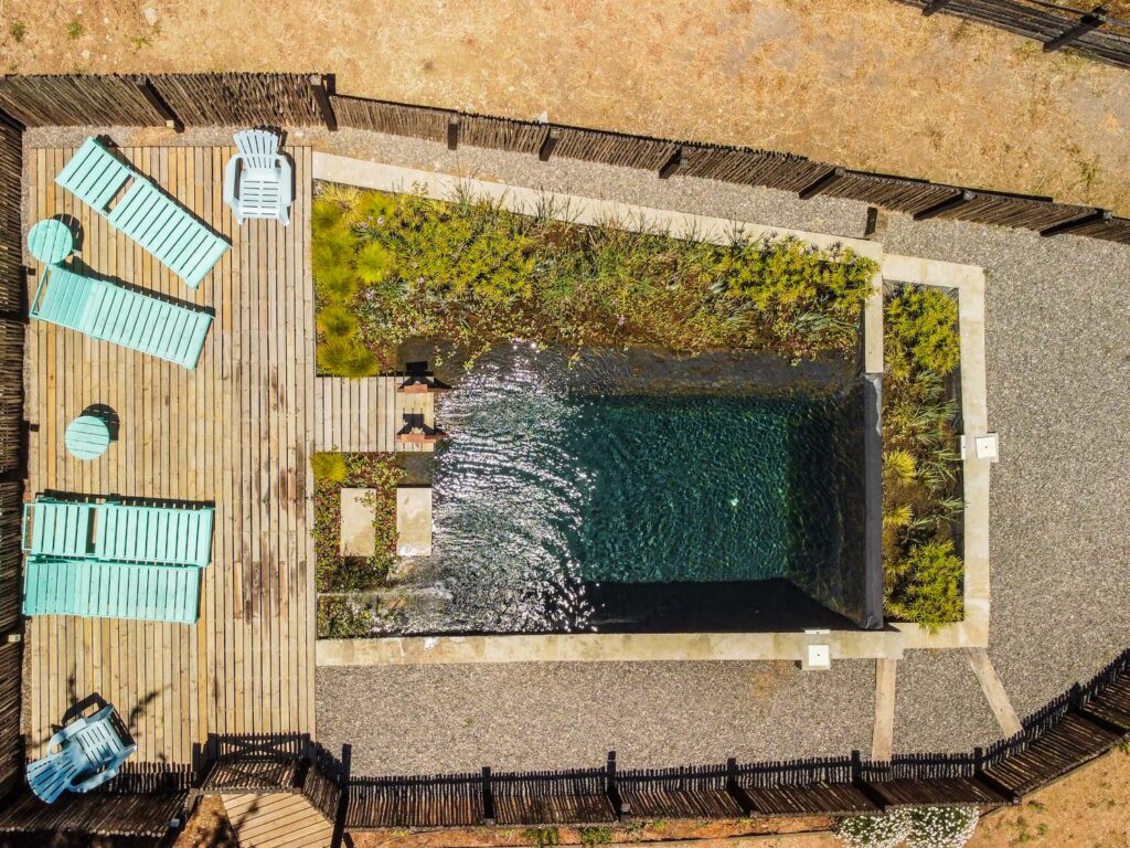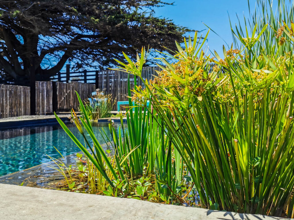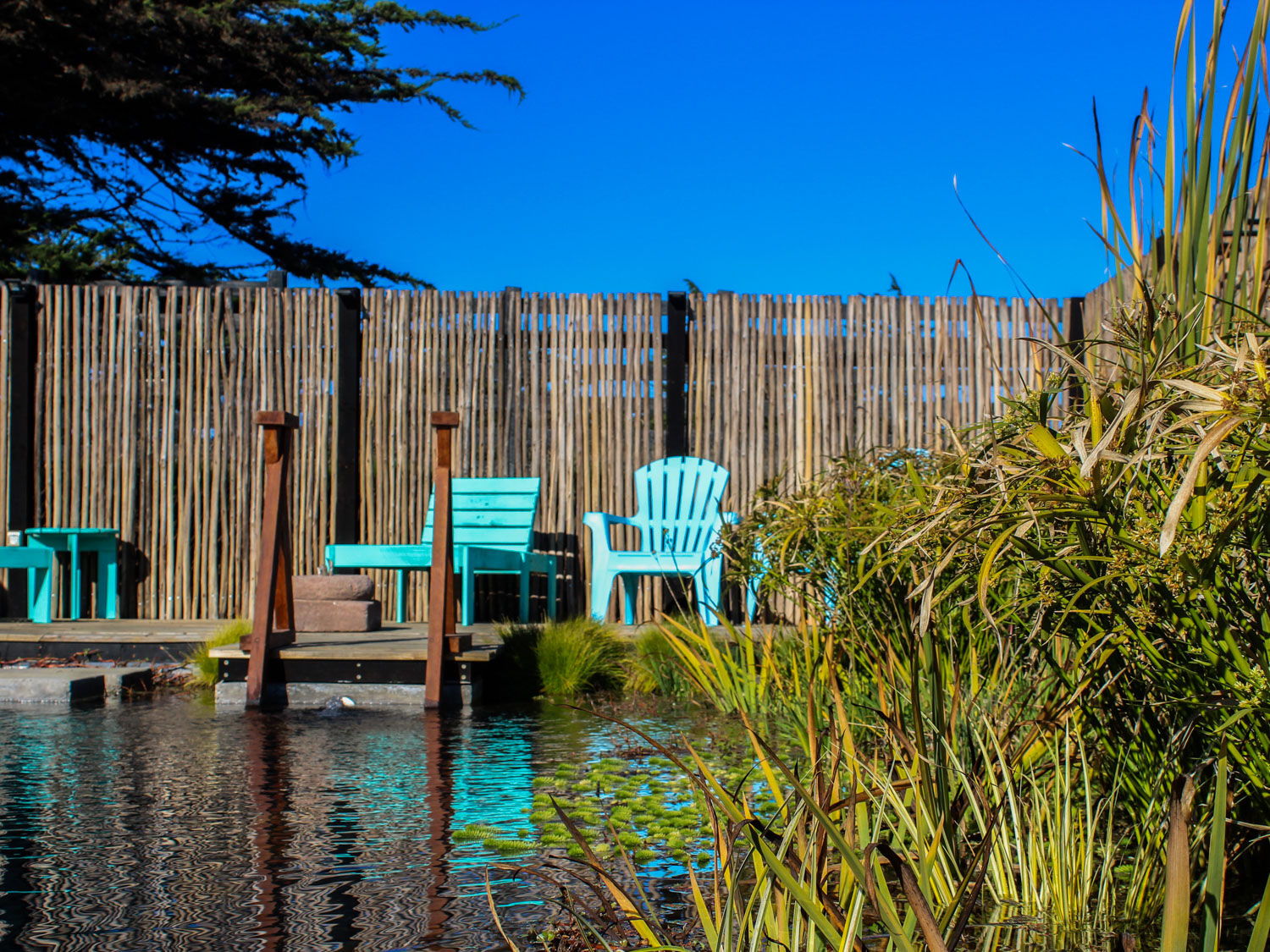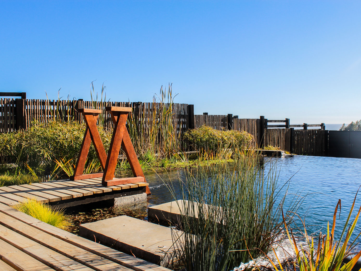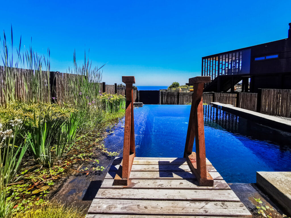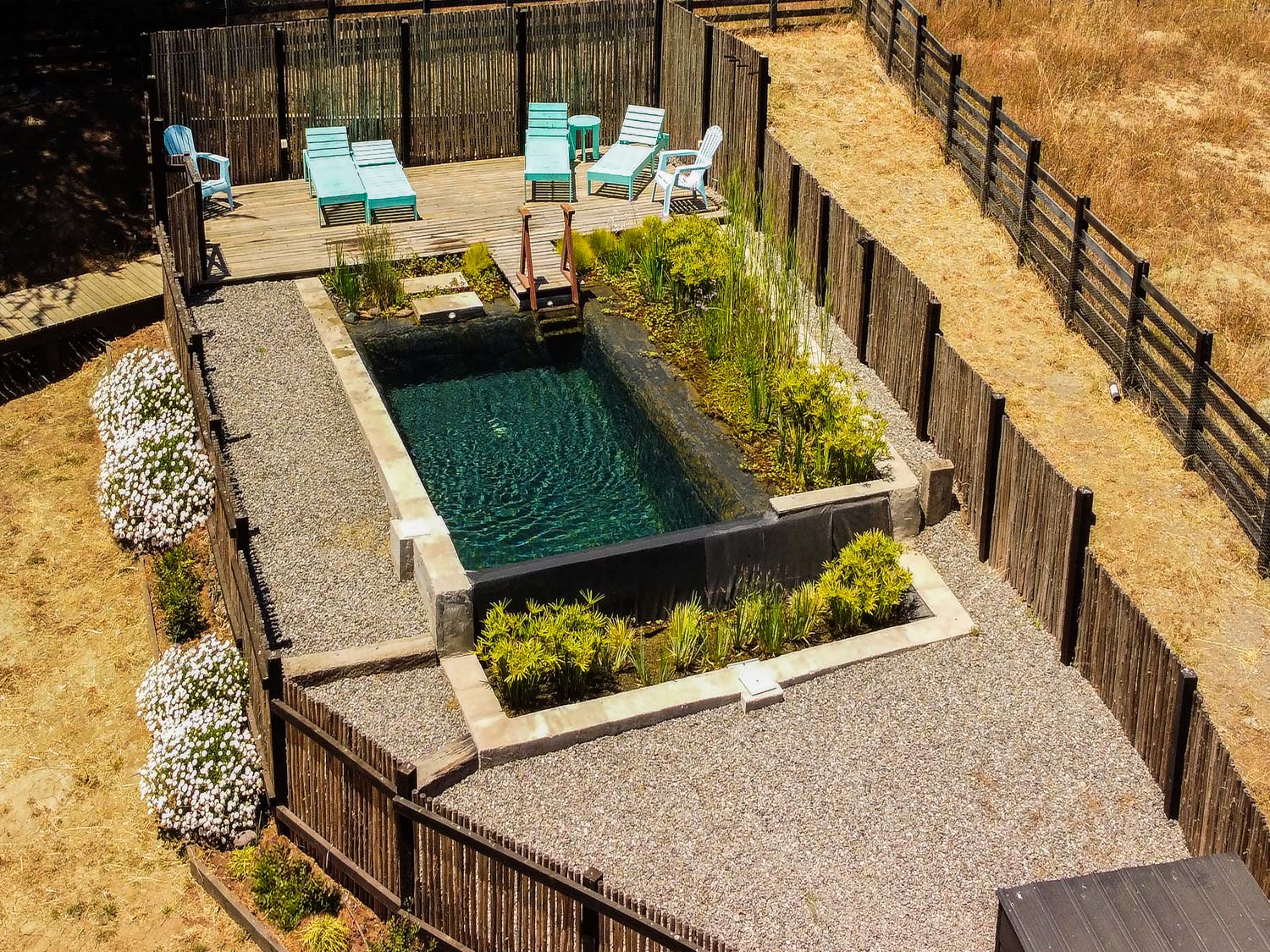 La piscina fue impermeabilizada con membrana de PVC color negro, logrando una estética sobria y natural que se funde con el entorno. El diseño incluye dos zonas de regeneración, fundamentales para el proceso de depuración del agua, reduciendo la necesidad de mantenimiento y asegurando una experiencia sustentable y armónica con la naturaleza.